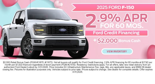By calling Rock Hill Ford or submitting your information online, you consent to receiving communications from us via phone call, text message, email, or other electronic means including communications from our automated or AI assisted systems regarding your inquiry. You may opt out of these communications at any time by following the instructions provided in our communications.