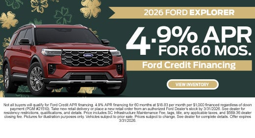 By calling Rock Hill Ford or submitting your information online, you consent to receiving communications from us via phone call, text message, email, or other electronic means including communications from our automated or AI assisted systems regarding your inquiry. You may opt out of these communications at any time by following the instructions provided in our communications.